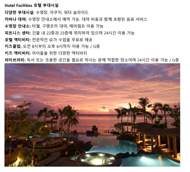 ☞ [두짓타니 부대시설]바로가기 ※ 호텔 객실 가능 여부 체크 후 예약 확정드립니다. 확정서는 출발 3일전에 전달 드립니다.※ 호텔 사정으로 동일 호텔의 상위 카테고리의 객실이나, 다른 리조트로 변동시 추가금이 발생될 수 있습니다.