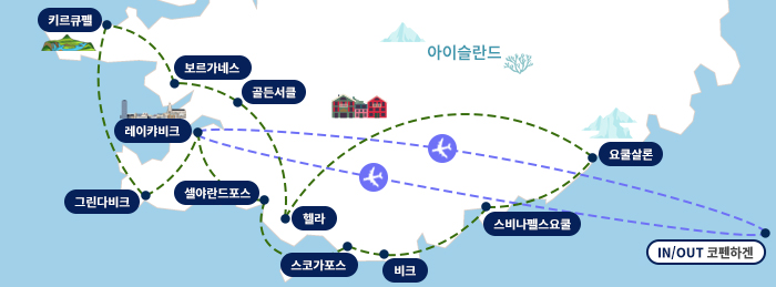 ※ 동계기간은 아이슬란드 극야시즌으로 오전 11시~오후 3시 정도까지만 해가 떠 있어, 일부 관광지는 야간 관광 형태로 진행 될 수 있습니다.√ 전 일정 노옵션/노쇼핑으로 구성 √ 북유럽 직항 항공사 스칸디나비아 항공 인천-코펜하겐 비즈니스석 왕복 탑승- 대한항공 스카이패스 마일리지 적립 가능 (약 14,000 마일리지 적립)- 코펜하겐~레이캬비크 구간 왕복 현지 국제선 이동 2회 포함 (일반석) ※ 비즈니스석 단체 항공권으로 항공사에서 좌석 배정하며 사전 좌석 지정은 불가합니다 .√ 전일정 일급(★★★) 호텔 숙박√ 품격있고 특별한 레스토랑에서의 식사 제공 ① 블루라군 내 레스토랑 'LAVA'에서 즐기는 '품격있는 식사'(블루라군 온천 방문이 불가할 시 레이캬비크 시내의 식당으로 대체 됩니다.)② 아이슬란드 호텔식(set 메뉴 or 뷔페식)/중국식/현지식 등 포함※ 현지 사정에 따라 메뉴는 변경 될 수 있습니다.■ 아이슬란드의 특별한 겨울 여행 ■① 경이로운 빛의 향연 [아이슬란드 오로라 헌팅 투어]② 세계 5대 온천으로 푸른 빛의 지열 노천 온천인 [블루라군 온천욕(개인용 가운 및 타월 제공)](블루라군 입장 불가시 드넓은 바다를 바라보며 온천을 즐길 수 있는 [스카이 라군 온천욕]으로 대체 됩니다.)■ 아이슬란드 여행 포함 관광지 ■① 세계 최북단에 위치한 아이슬란드의 수도 '레이캬비크' : 할그림스키르캬 교회, 하르파 콘서트 홀, 호프디 하우스 등② 에매랄드 빛 푸른 빙하들을 감상 할 수 있는 '요쿨살론 라군' : 요쿨살론 빙하 조망, 다이아몬드비치③ 우뚝 솟은 빙하 사이에 그림같은 전망의 폭포 : 스코가포스, 셀야란드포스④ 아이슬란드에서 가장 유명한 관광 루트 '골든서클' : 싱벨리어국립공원, 게이시르간헐천, 굴포스, 케리드분화구 ⑤ 아이슬란드 서부의 하이라이트이자 드라마틱한 풍경으로 유명한 '스나이펠스네스' : 키르큐펠 산&키르큐펠 포스√ 전일정 북유럽 전문투어리더 동행 √ 전 일정 20~30인승 차량 탑승- 출발인원에 따라 차량 크기 결정(환경 보호를 위한 정책)- 12명 이하 출발 시 20인승 버스 탑승√ 전 일정 수신기 대여