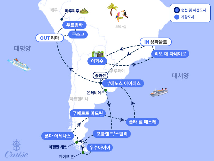[도시 안내] - 잉카문명의 보고 쿠스코와 세계 7대 불가사의로 불리우는 마추픽추 관광- 세계 3대 폭포중에 하나인 이과수 폭포 관광- 코르코바도 언덕의 예수상으로 유명한 리오 데 자네이로 관광- 페루의 수도이자 남미 이동의 중심인 리마 관광- 아리헨티나의 수도이며 크루즈를 탑승하는 남미의 파리, 부에노스 아이레스 관광- 세계 최남단의 항구도시 아름다운 풍경의 우수아이아 기항- 남미 최남단, 세계의 끝이라 일컬어지는 케이프 혼 기항- 고래잡이 전초기지, 땅속 굴을 파는 마젤란 펭귄이 있는 포트 스탠리 기항- 푼타 톰보 펭귄 서식지가 있는 푸에르토 마드린 기항- 우루과이의 수도, 우루과이 최대의 피서지 몬테비데오 기항