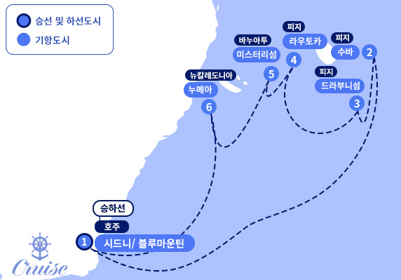 [도시 안내] ▶ 오페라하우스와 하버 브리지가 있는 호주의 상징적인 도시이자 활기찬 문화와 자연이 공존하는 도시 시드니 ▶ 시드니 서쪽에 위치한 유네스코 세계유산 국립공원으로 유칼립투스 숲과 사암 절벽이 장관을 이루는 블루마운틴 ▶ 피지의 수도이자 정치, 경제의 중심지로 현대적인 도시 풍경과 피지 고유의 문화가 공존하는 수바 ▶ 때묻지 않은 자연을 그대로 간직한 작은 무인도로 크루즈 관광객에게 완벽한 해변 휴양을 선사하는 드라부니 섬 ▶ 설탕의 도시라는 별명을 가진 피지 제2의 도시로 활기 넘치는 시장과 사탕수수 산업의 중심지 라우토카 ▶ 크루즈선이 기항할 때만 문을 여는 이색적인 현지 시장과 맑고 투명한 바다가 매력적인 무인도 미스터리 섬 ▶ 작은 프랑스라는 별명처럼 프랑스풍의 우아함과 남태평양의 아름다운 자연이 조화를 이루는 누벨칼레도니의 수도 누메아