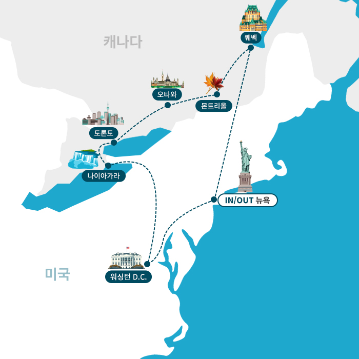 인천-뉴욕(2)-워싱턴/해리스버그(1)-나이아가라(1)-토론토(1)-천섬/몬트리올(1)-퀘벡/콩코드(1)-보스턴-우드버리/뉴욕(1)-인천